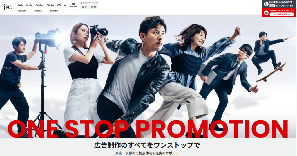 株式会社ジェー・ピー・シーは、東京・京都の二拠点体制で、Web・映像・カタログなどあらゆるプロモーション制作をワンストップで提供する総合クリエイティブ企業です。