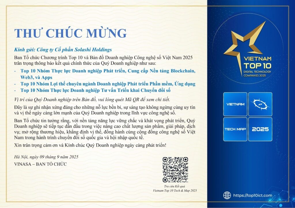 2025年10月9日、ハノイのForevermark – The Zei Plazaにて、VINASA(ベトナムソフトウェア・ITサービス協会)が主催する「Vietnam Top 10 Tech & Map 2025」の表彰式が開催されました。